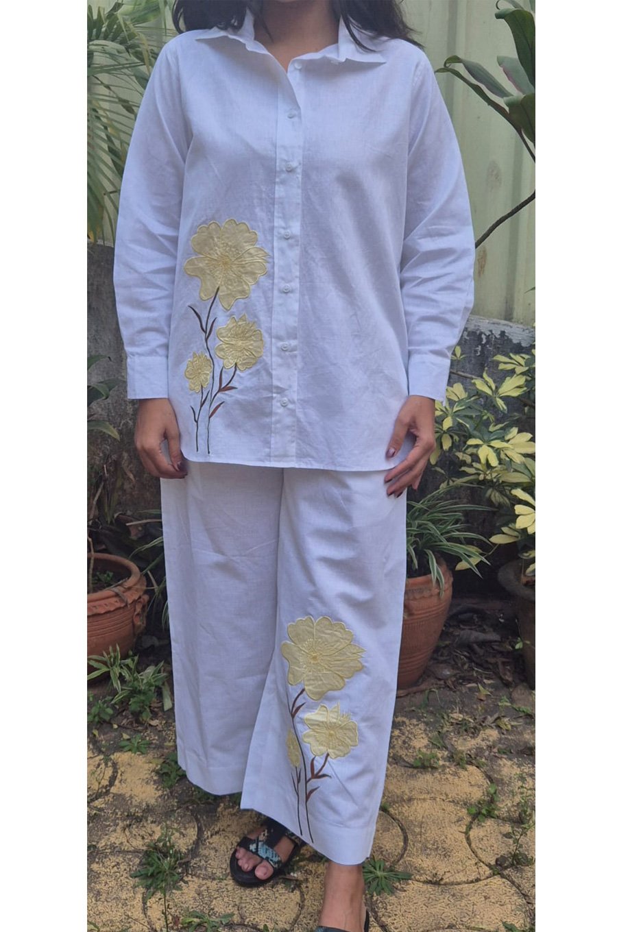 Made in white cotton linen,  relaxed fit with patch work on the shirt and the pants