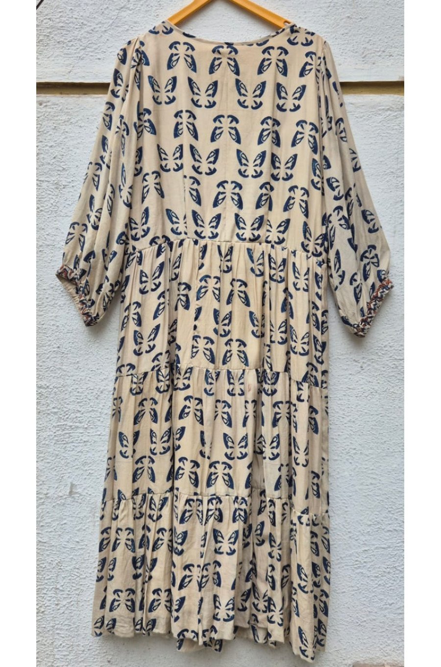 Ajrakh block print pleated yoke , tiered dress with attached cotton lining crafted for comfort and style. Fabric: Muslin (bemberg) Care: Dry clean only